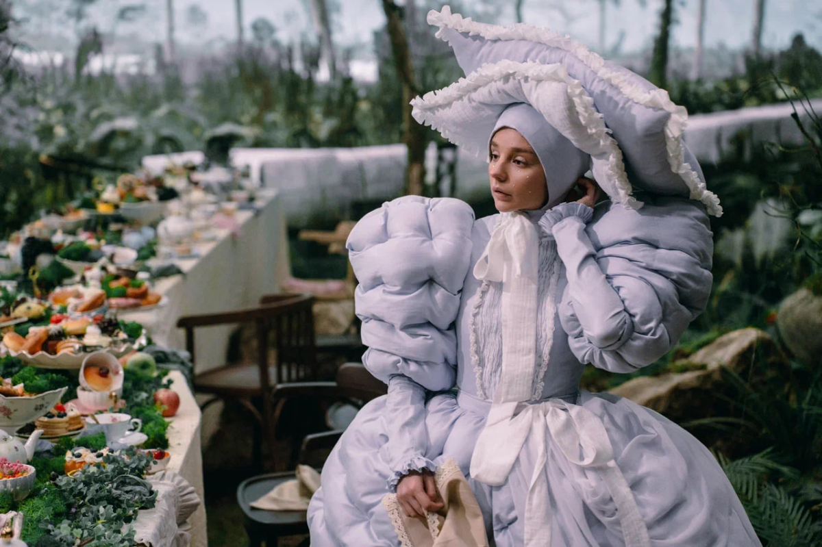 Традиционно Алису изображают в голубом платье, но розовый цвет помог создать дополнительный контраст с обилием зелени в кадре. А на приталенном фасоне платья, в котором Алиса ходит большую часть фильма, настояла сама Анна Пересильд. Ей хотелось через костюм подчеркнуть хрупкость героини.