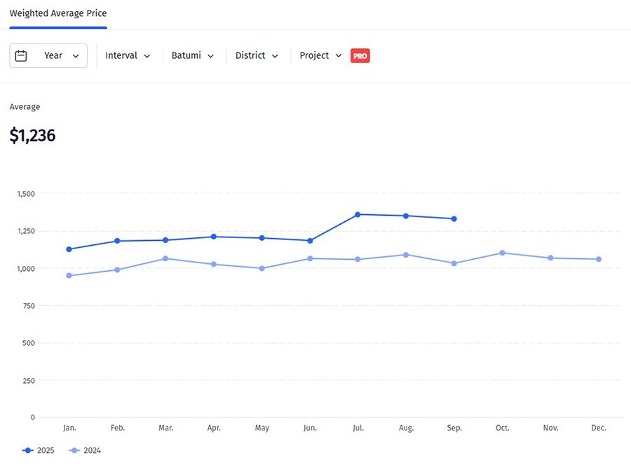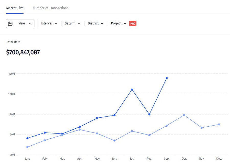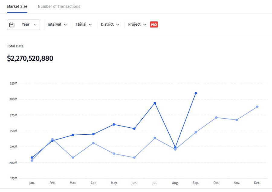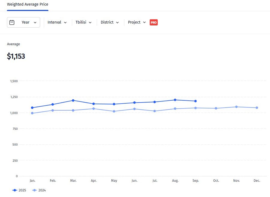 Столичный рынок осенью демонстрирует устойчивый рост. В сентябре 2025 года в Тбилиси было зарегистрировано 4 054 сделки с квартирами – это на 14,9% больше, чем в таком же месяце 2024-го. Совокупный объем рынка достиг 310 млн долларов (+25,1%).