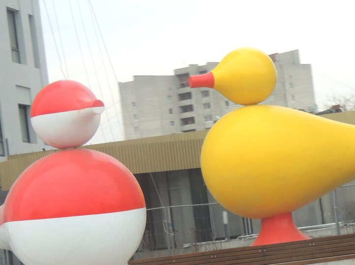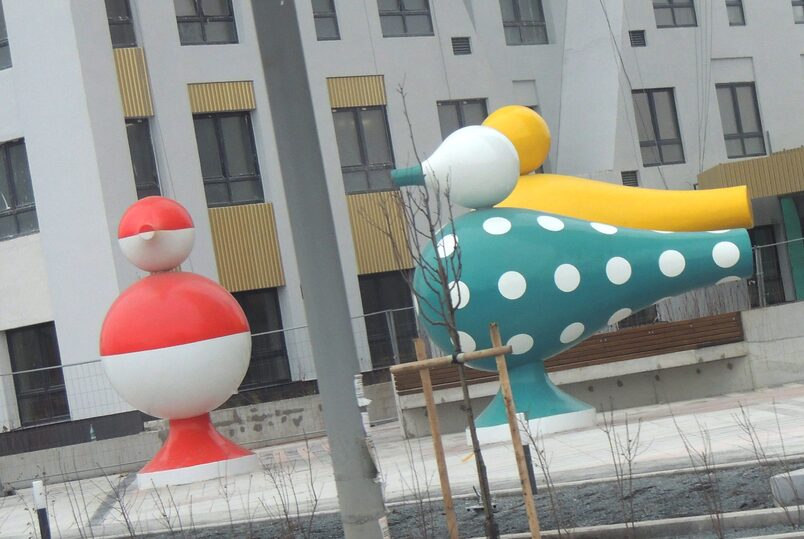 Три четырехметровые птички-свистульки выполнены в цветах, которые отсылают к знакомым сюжетам, домашним предметам, формирующим уют в квартире.