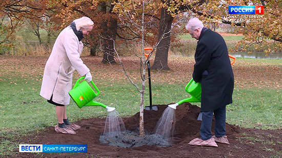 Зеленая история Царского Села. В парке перед Александровским дворцом высадили молодой дуб. Саженец прошел настоящую древесную школу. Сотрудники музея-заповедника 14 лет назад взяли желудь от двухвекового исполина. А потом под присмотром садовников он рос и ждал своего часа в открытом грунте. На новое место дерево пересадили директор Государственного Эрмитажа Михаил Пиотровский и директор Музея-заповедника "Царское Село" Ольга Таратынова.