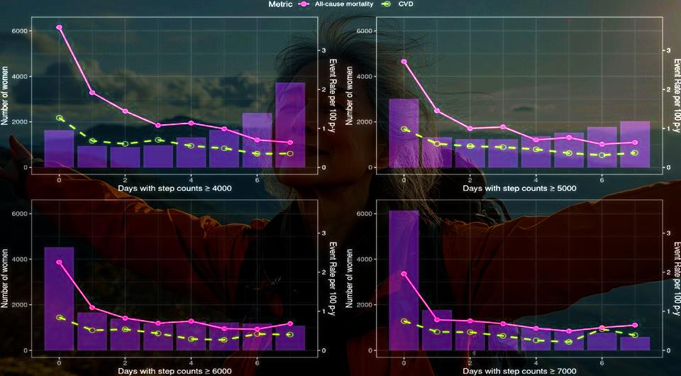 Рикута Хамая (Rikuta Hamaya) из бостонской Больницы Brigham and Women’s с коллегами провел проспективное когортное исследование и обнаружил, что прохождение минимум 4000 шагов в день хотя бы раз или два в неделю связано со значительным снижением смертности у пожилых женщин, причем это имеет большее значение, чем количество дней с ходьбой. В работе использовали данные 13547 участниц (средний возраст 71,8 года) исследования WHS, которые на момент включения не страдали сердечно-сосудистыми и онкологическими заболеваниями и в начале исследования семь дней подряд носили акселерометр. На основании этого их разделили по количеству дней в неделю, в которые они проходили более четырех, пяти, шести или семи тысяч шагов. Связь этого со смертностью и сердечно-сосудистыми заболеваниями оценивали с помощью коксовской регрессии. Результаты опубликованы в British Journal of Sports Medicine.