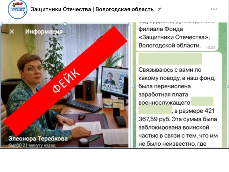 Как сообщает в своих соцсетях Вологодское отделение фонда «Защитники Отечества», гражданам стали приходить фейковые сообщения от руководителя филиала Элеоноры Теребковой.