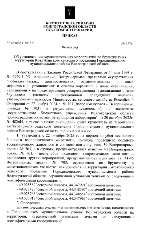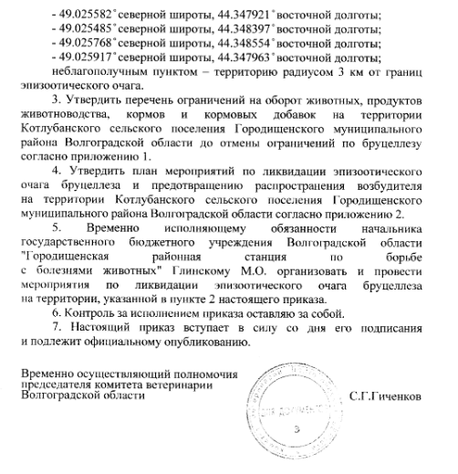 В Городищенском районе на территории Котлубанского сельского поселения нашли бруцеллёз. В населённом пункте ввели ограничительные мероприятия, чтобы не допустить распространение болезни. Они будут проводиться в эпизоотическом очаге до убоя последнего больного восприимчивого животного.