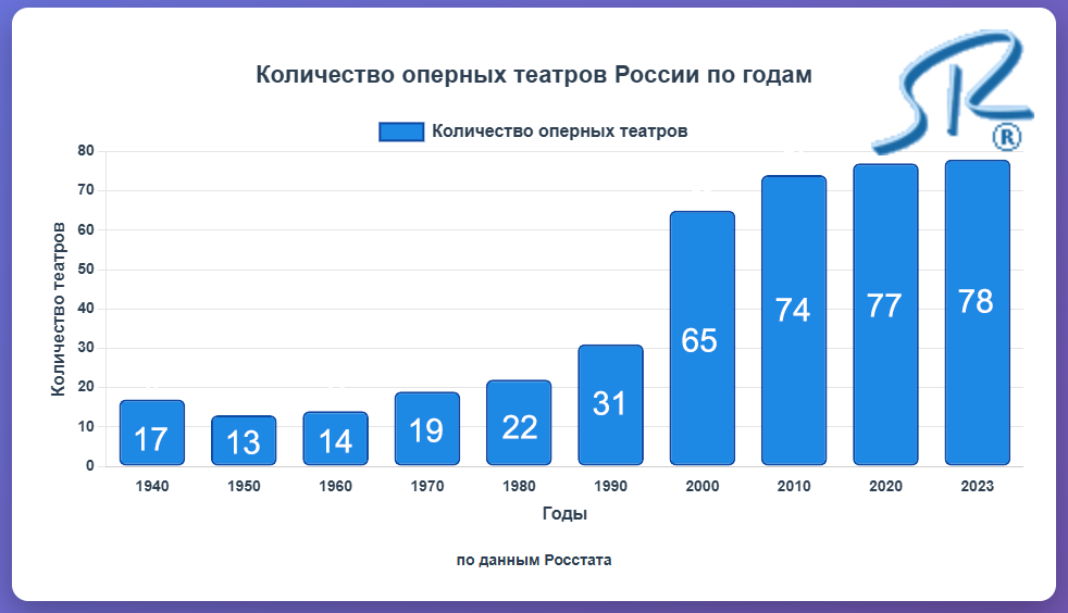 Настоящий прорыв в оперном искусстве России произошел в 90-е годы, и к 2000 году количество оперных театров достигло 65 — более чем двукратный рост за десятилетие. Этот скачок связан с изменением культурной политики и признанием значения оперы как важной части национального наследия. Началось активное восстановление старых и создание новых театральных площадок по всей стране.
