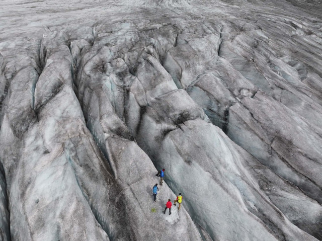 3. Группа учёных из Швейцарского федерального технологического института в Цюрихе стоит среди трещин на Ронском леднике во время сбора данных недалеко от Глетча, Швейцария, в пятницу, 22 августа 2025 года. (Фото Шона Гэллапа/Getty Images)
