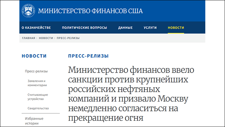 Сайт Минфина США (treasury.gov) с объявлением антирусских санкций, скриншот страницы, автоперевод