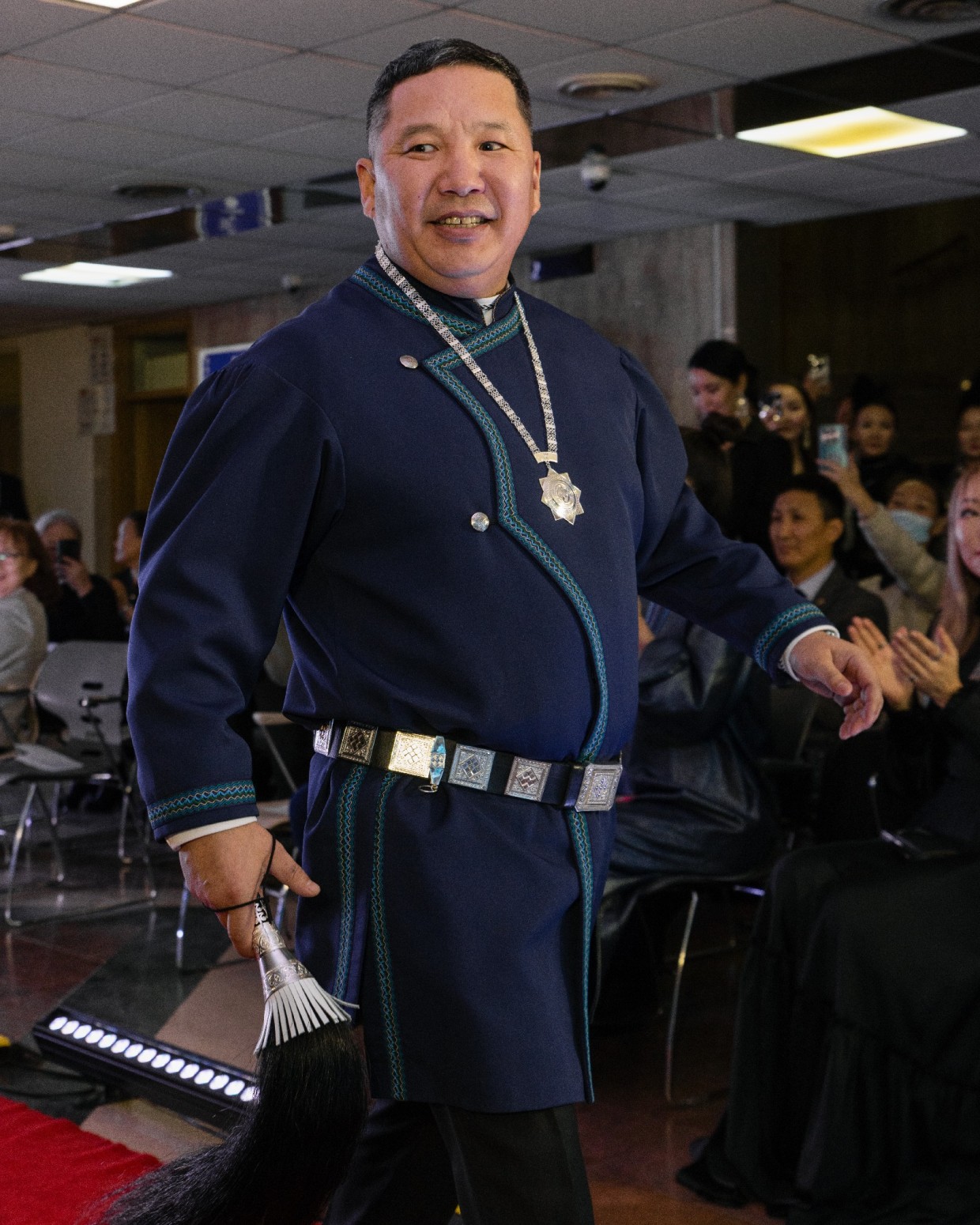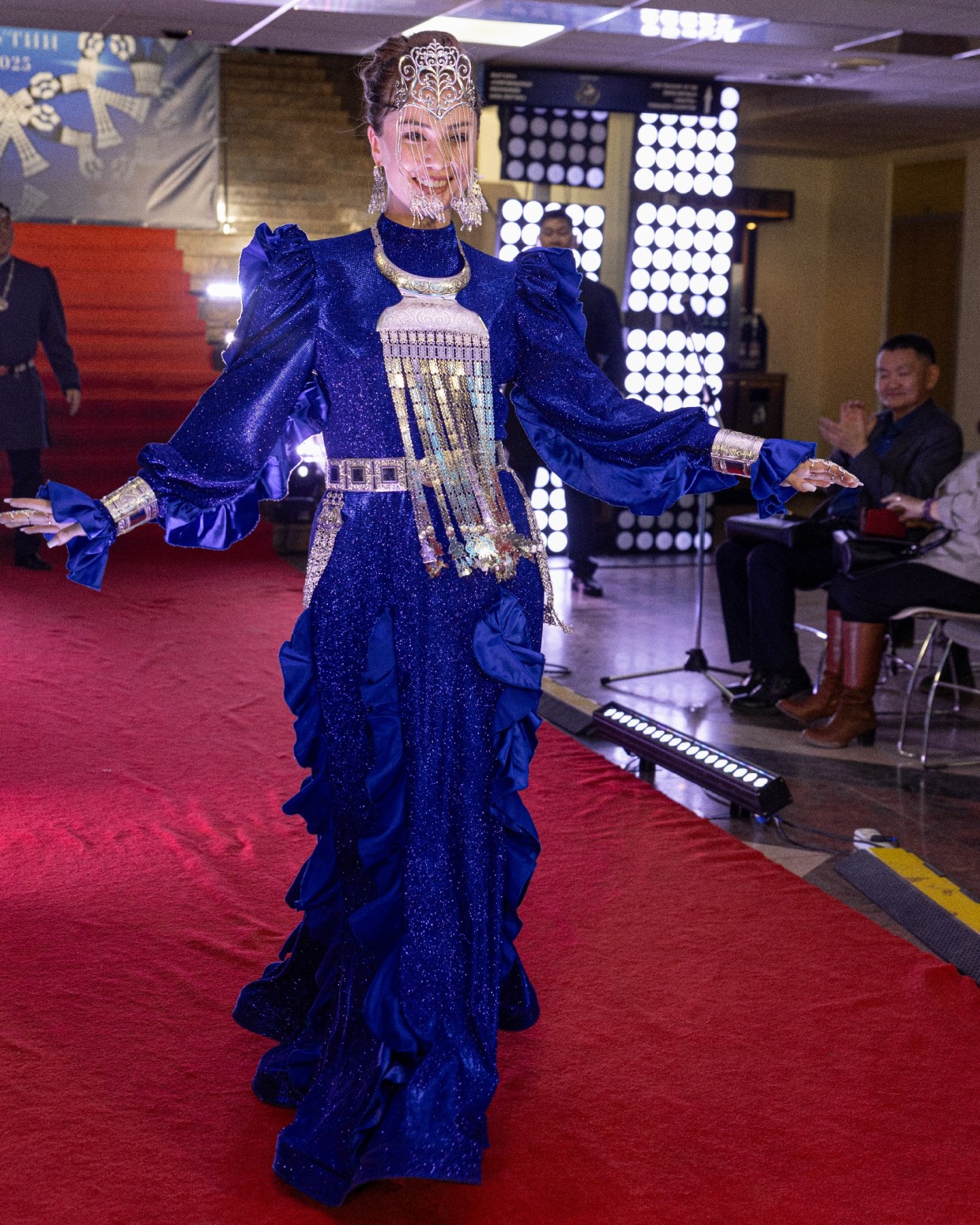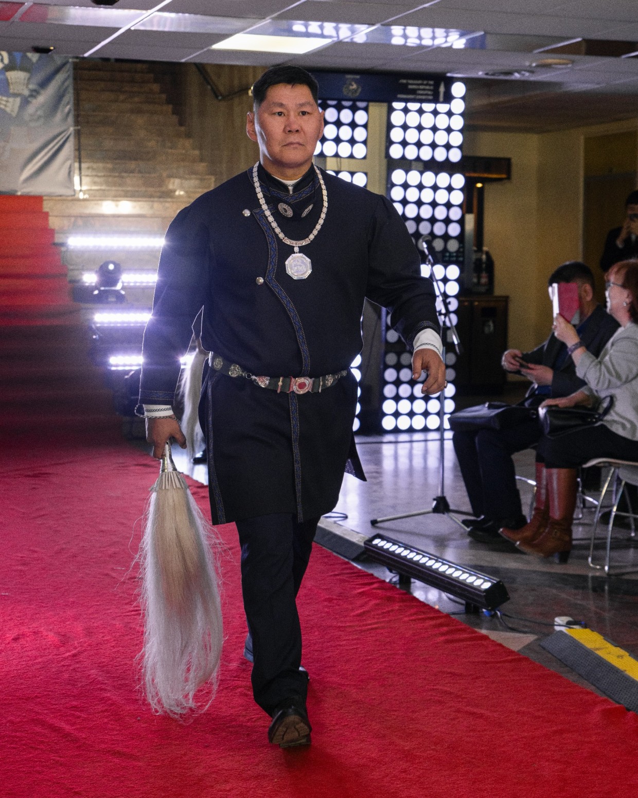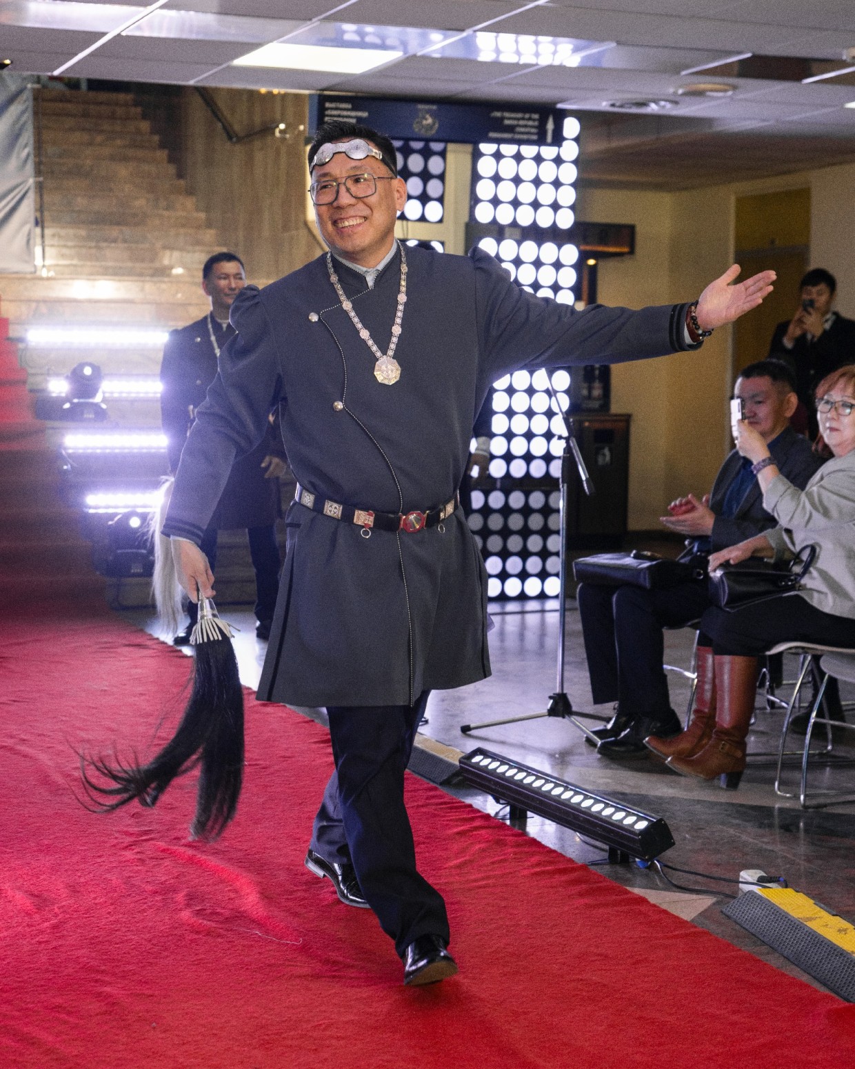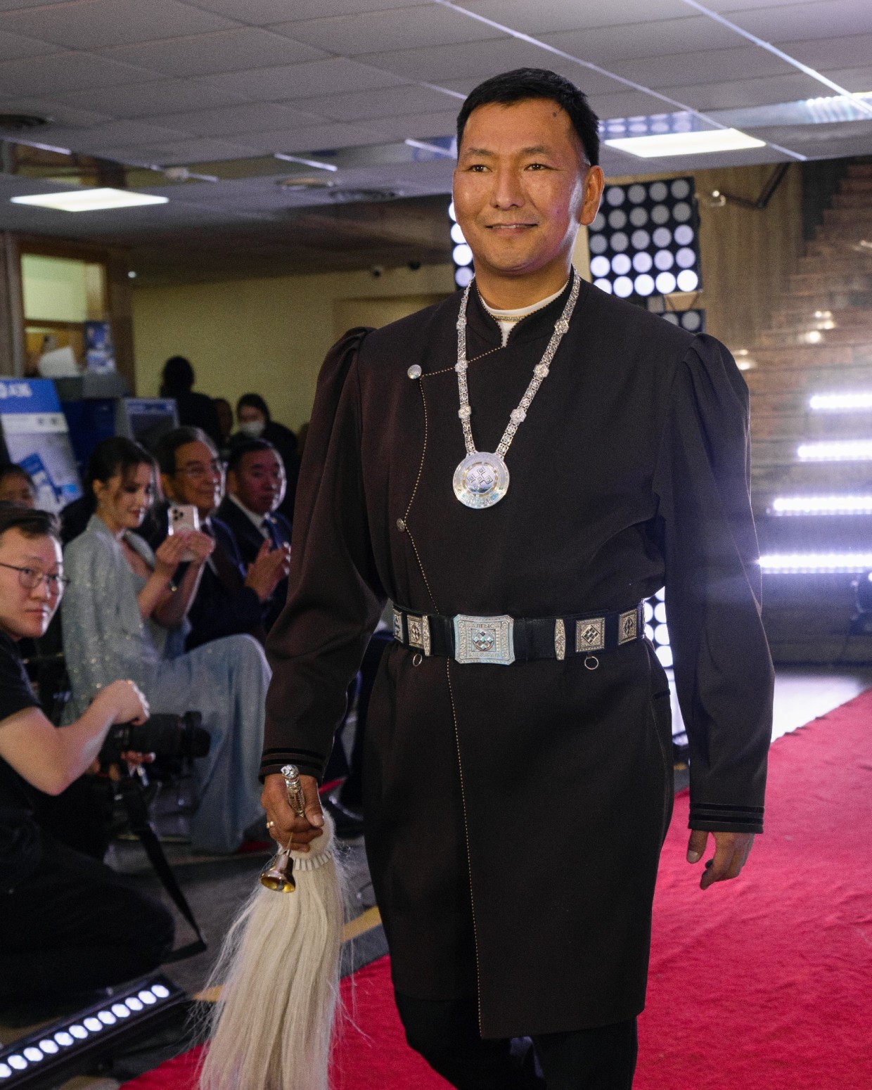 Первым на подиум вышел Виталий Очиров, певец и алгысчит. В камзоле шоколадного оттенка с наборным поясом из серебряных элементов и нагрудным украшением Виталий, улыбаясь и здороваясь со знакомыми, прошел по красной дорожке, олицетворяя уверенность и обаяние.