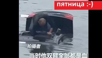 В Китае случайный свидетель аварии отчаянными и решительными действиями спас водителя легковушки, который оказался запертым в тонущем авто.