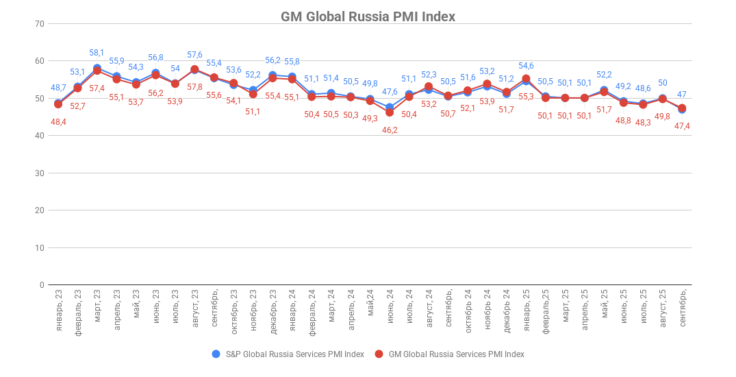 По итогам сентября 2025 года индекс деловой активности «ГлобалМедиа PMI Россия» показал резкое ухудшение ситуации в секторе услуг. После кратковременной стабилизации в августе индекс обвалился до 47,4 п.п., что стало самым значительным падением с декабря 2022 года и вернуло его в рецессивную зону.