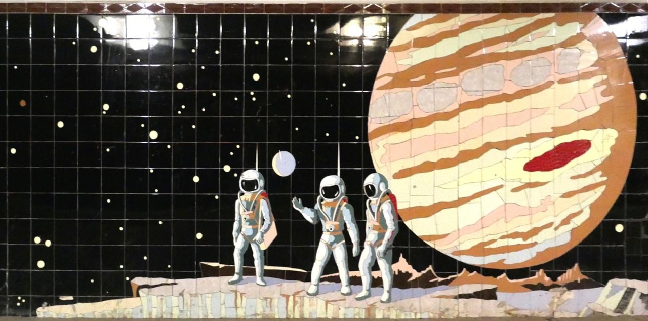 Пик развития советской монументальной мозаики тоже выпал на 1970-е годы и органично впитал в себя космическую тематику. Можно вспомнить панно Андрея Васнецова «Советские люди — покорители космоса» в Калуге, панно Фрица Эйзеля «Космос-Земля-Человек» в Потсдаме или подземный переход на пересечении улицы Большой Садовой и Кировского проспекта в Ростове-на-Дону.