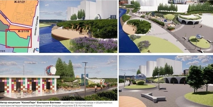 «Акцентными объектами будущего парка станут крытый фудкорт, напоминающий «летающую тарелку», а также второй фудкорт с витражным остеклением, которые отсылают одновременно и к советской эстетике, и к современным архитектуре. Центральными арт-объектами станут инверсионные скульптуры — шары, покрытые мозаикой, внутри которых воссозданы профили известных космонавтов. Их разработка осуществлялась при поддержке известного ростовского скульптора и мозаичиста Марины Яблонской, также выпускницы ААИ ЮФУ», — рассказала Екатерина Бахтеева.