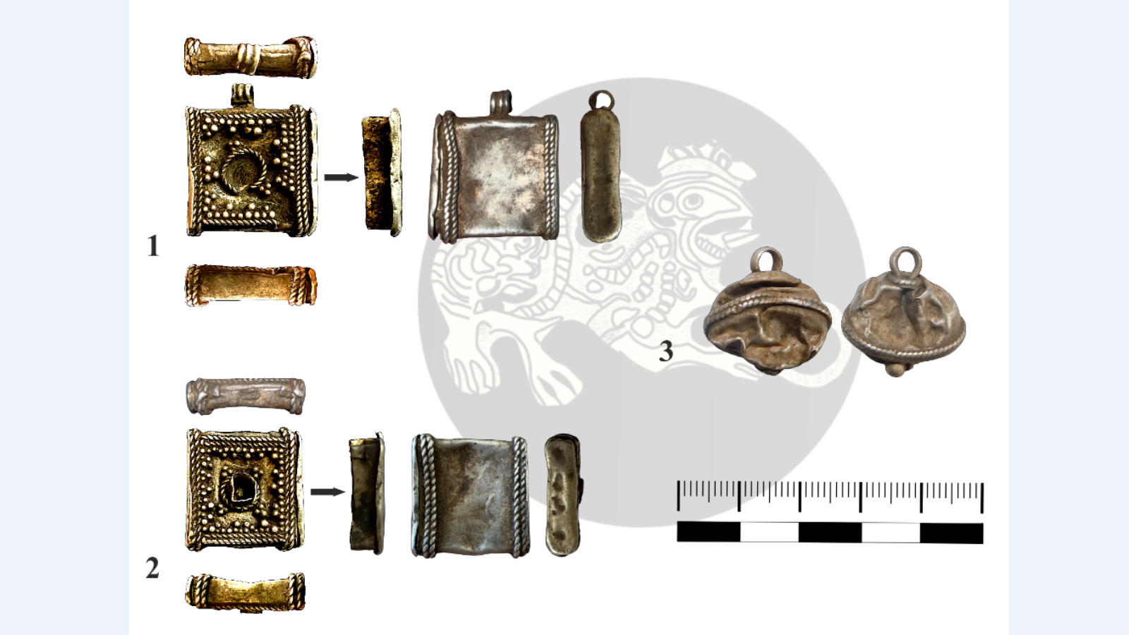 Как уточнили в комитете, при изготовлении подвесок ювелир использовал технику пайки, зерни, филиграни в виде скани, касты из тонкой полоски металла, припаянной на ребро, и рифления. Там же отметили, что эти амулеты изготовлены из высокопробного серебра (96,12 и 91,27%). Кроме того, они могли подвергаться золочению — на их поверхности выявлено присутствие золота в 0,42 и 0,47%.