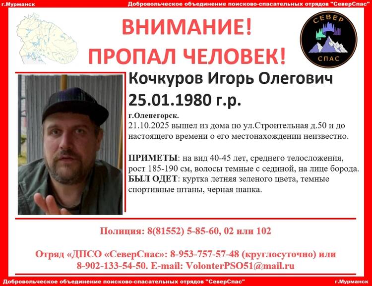 Поисковый отряд «СеверСпас» ведет поиски жителя Оленегорска Игоря Кочкурова. На вид ему 40-45 лет, среднего телосложения, рост 185-190 см, волосы темные с сединой, на лице борода.