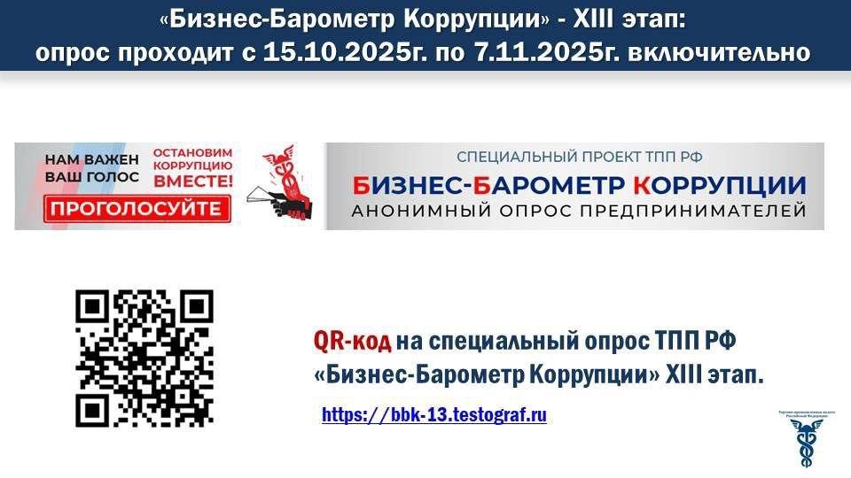 13-й этап нашего Всероссийского проекта «Бизнес-Барометр Коррупции»* - анонимного опроса предпринимателей с целью замера антикоррупционных настроений и оценки антикоррупционной политики в России.