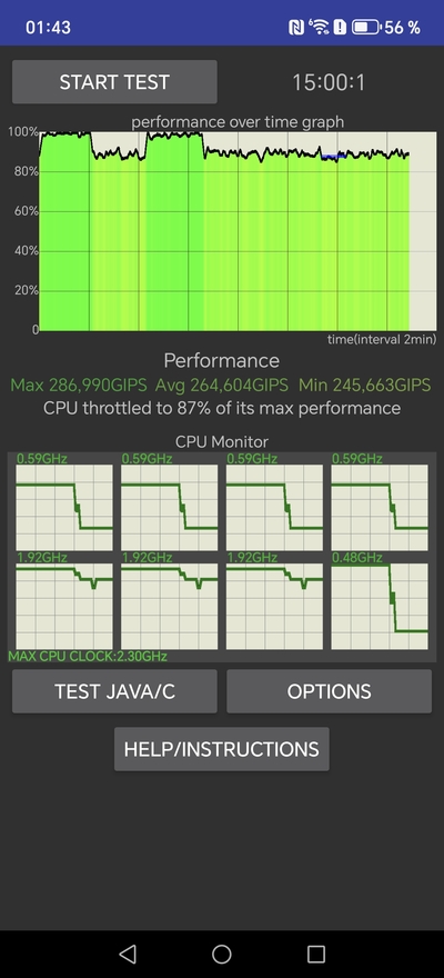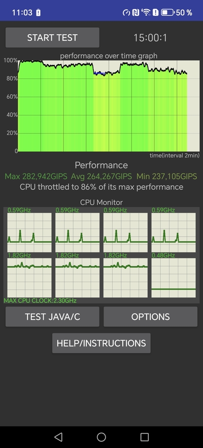 В 15-минутном тесте CPU Throttling Test падение производительности составляет 13%. При активации производительного режима троттлинг незначительно увеличивается до 14%. В повседневных задачах смартфон практически не нагревается — температура процессора остаётся в пределах 40 градусов, а аккумулятор — ниже 35 градусов. В игровых сценариях нагрев становится более ощутимым — процессор может прогреваться до 50 градусов, а батарея — до 38 градусов. Тепло концентрируется в области блока камеры, где корпус становится умеренно тёплым.