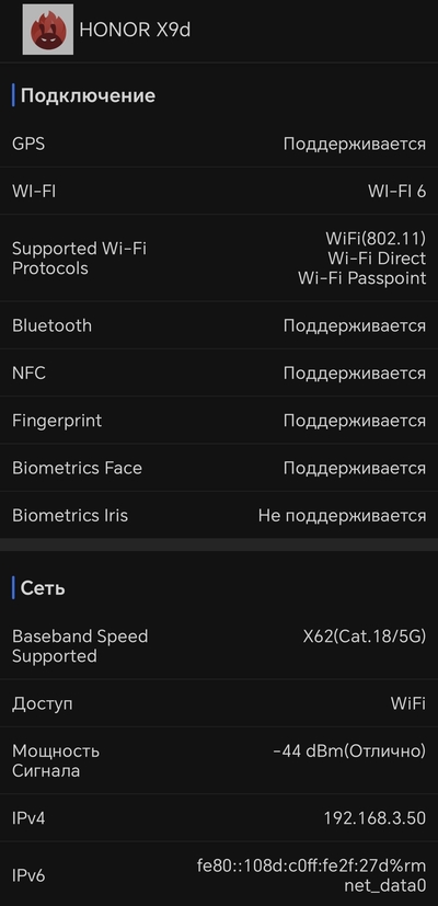 Отдельного разъёма для наушников в Honor X9d не предусмотрено, для подключения проводной гарнитуры потребуется переходник с цифро-аналоговым преобразователем (ЦАП). Смартфон предлагает полную поддержку популярных кодеков для беспроводных решений — от базовых SBC и AAC до высококачественных LDAC и AptX, включая продвинутые версии AptX HD и AptX Adaptive.