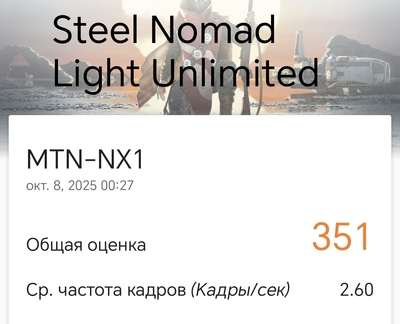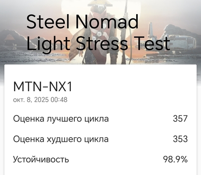 - Steel Nomad Light Stress Test — 357 (лучшая), 353 (худшая)