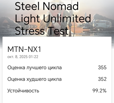 - Steel Nomad Light Unlimited Stress Test — 355 (лучшая), 352 (худшая)