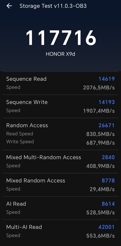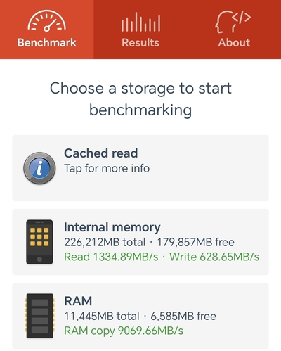 Конфигурация тестового образца включает 12 ГБ оперативной памяти стандарта LPDDR5, которая дополнена ещё 12 ГБ виртуальной памяти за счёт внутреннего хранилища. Встроенная память выполнена по стандарту UFS 3.1, её объём составляет 256 ГБ. Слот для карт памяти в смартфоне не предусмотрен.