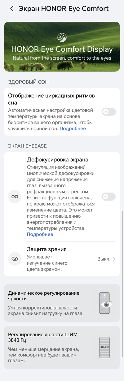 Производитель оснастил смартфон полным набором функций заботы о зрении Honor Eye Comfort. Сюда входят дефокусировка экрана для профилактики близорукости, фильтр синего свечения и настройка отображения в соответствии с циркадными ритмами сна.