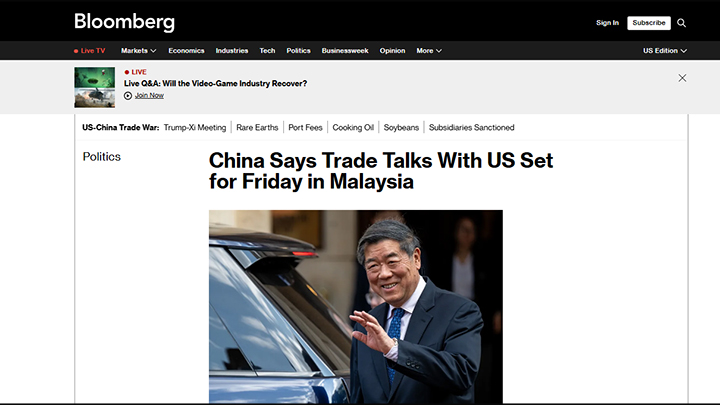 Очередной раунд переговоров между Китаем и США пройдёт в Малайзии. Скриншот: Bloomberg