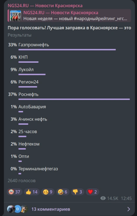 В голосовании на лучшую АЗС приняли участие 2640 человек, выбирали среди 11 заправок. Таким образом, лучшей заправкой в Красноярске, по мнению читателей NGS24.RU, стала «Роснефть», она заняла первое место.