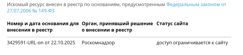 Ресурс ограничили по требованию Роскомнадзора. Причиной закрытия доступа стали обоснования, предусмотренные Федеральным законом «Об информации, информационных технологиях и о защите информации». Какие именно нарушения замечены на сайте, пока неизвестно.