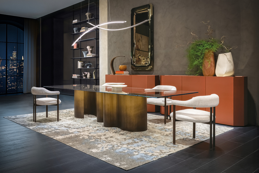Чтобы в полной мере любоваться красотой основания, можно выбрать столешницу из прозрачного стекла. В такой подаче обеденный стол превращается в арт-объект.