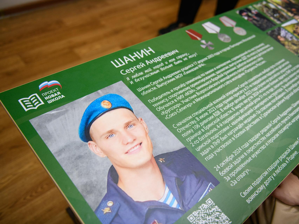 В лыткаринской гимназии № 4 состоялось торжественное открытие «Парты героя». На ней теперь увековечено имя гвардии рядового Сергея Шанина, который учился в этой гимназии и героически погиб на специальной военной операции.