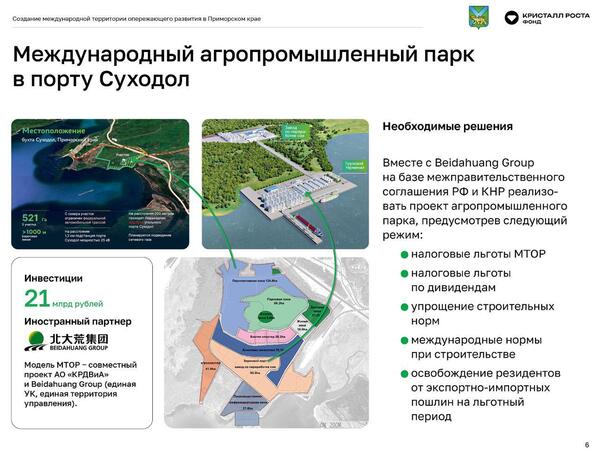 - Совместный с Beidahuang Group международный агропромышленный парк в бухте Суходол.