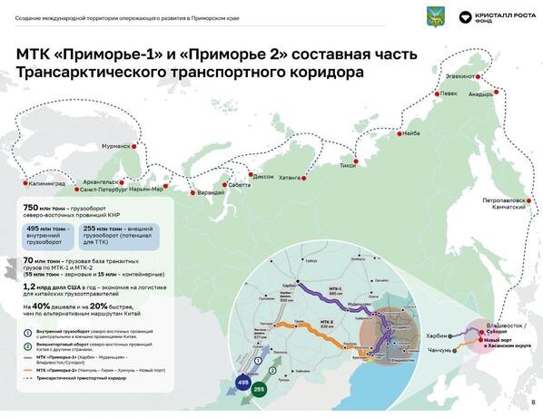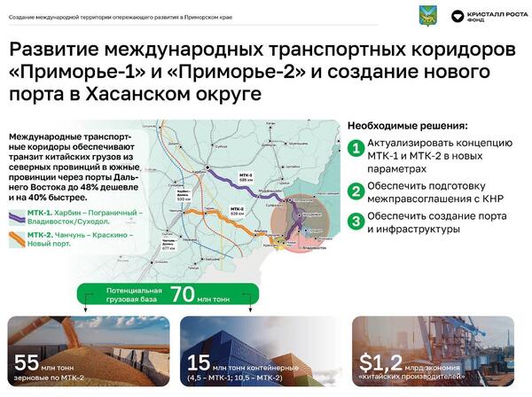 - Международные транспортные коридоры «Приморье-1» и «Приморье-2», обеспечивающие логистику грузов с севера на юг Китая через порты Дальнего Востока.