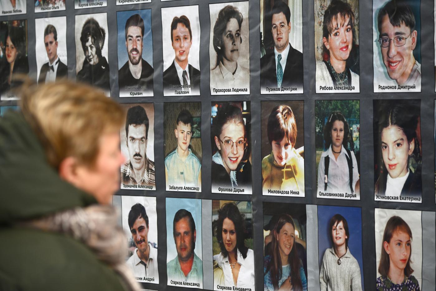 Женщина у мемориальной доски с фотографиями жертв захвата