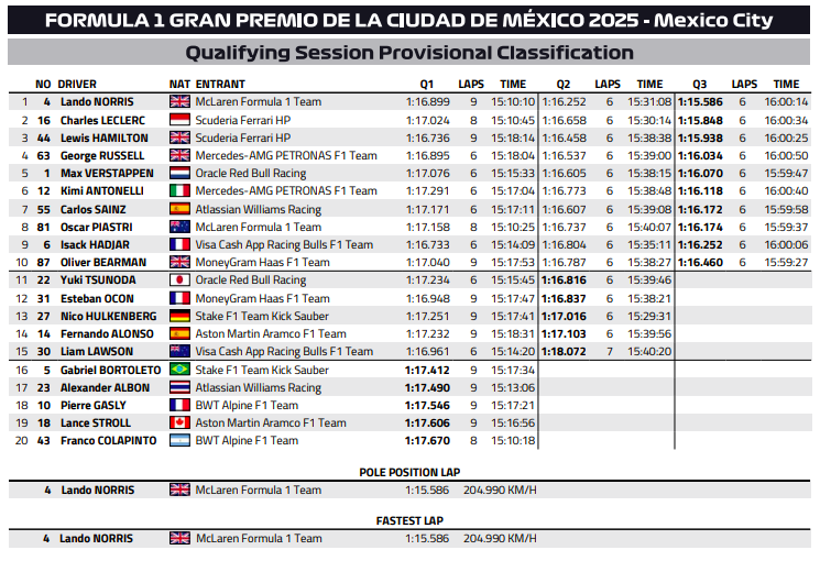 Пилот McLaren Ландо Норрис завоевал поул в квалификации Гран При Мексики. Представители Ferrari Шарль Леклер и Льюис Хэмилтон заняли второе и третье места соответственно.