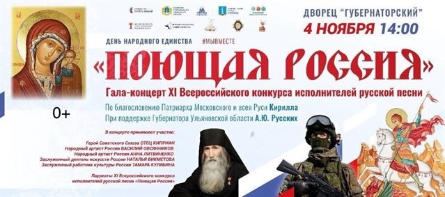 Во вторник, 4 ноября, в 14:00 во Дворце дружбы народов «Губернаторский» состоится гала-концерт «Поющая Россия» (0+), на котором артисты выступят с русскими народными, патриотическими, духовными песнями, колыбельными и песнями родного края. Концерт проходит в рамках XI Всероссийского конкурса исполнителей русской песни, который проводится в Ульяновске. В этом году он собрал более 700 участников из 22 регионов России. К ним присоединились музыканты из Беларуси, Индии и Китая.