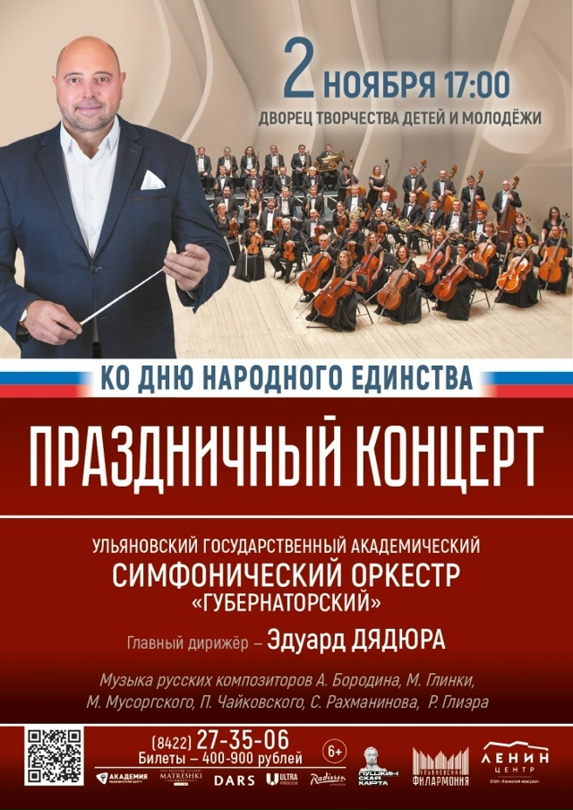 В воскресенье, 2 ноября, в 17:00 во Дворце творчества детей и молодежи в преддверии праздника пройдет концерт «Ко Дню народного единства» (6+). На сцене выступит Ульяновский государственный академический симфонический оркестр «Губернаторский» под руководством Эдуарда Дядюры. Программу представит заслуженный работник культуры России Лариса Куфтина.