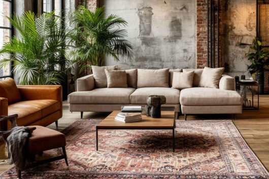 …Чтобы лет через 30 вернуться в визуальную культуру, дизайн и творческие проекты. Да, сегодня ковры снова в тренде. На фото – дизайнерское решение модной гостиной в стиле лофт.
