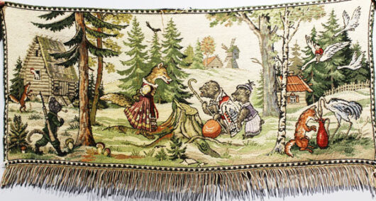 Примерно в это же время были очень популярны небольшие фабричные гобелены – их вешали над кроватями. Эти уютные коврики с лесными пейзажами, мельницами и живописными сельскими домиками буквально покорили сердца советских граждан, хотя значительную их часть везли из побежденной Германии – из ГДР. В нашей коллекции есть очень интересный немецкий гобелен для детской спальни – на нем вытканы герои русских сказок: здесь лиса, выманивающая петушка из терема; гуси-лебеди, умыкающие Иванушку; лиса и журавль около кувшина. Коврик привез своим детям военный из Тольятти, проходивший службу в Германии.