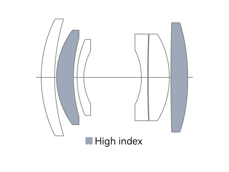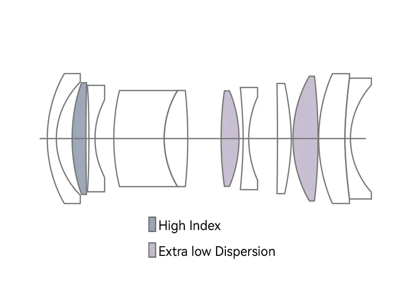В конструкции присутствует линза с высоким показателем преломления и две низкодисперсные линзы.