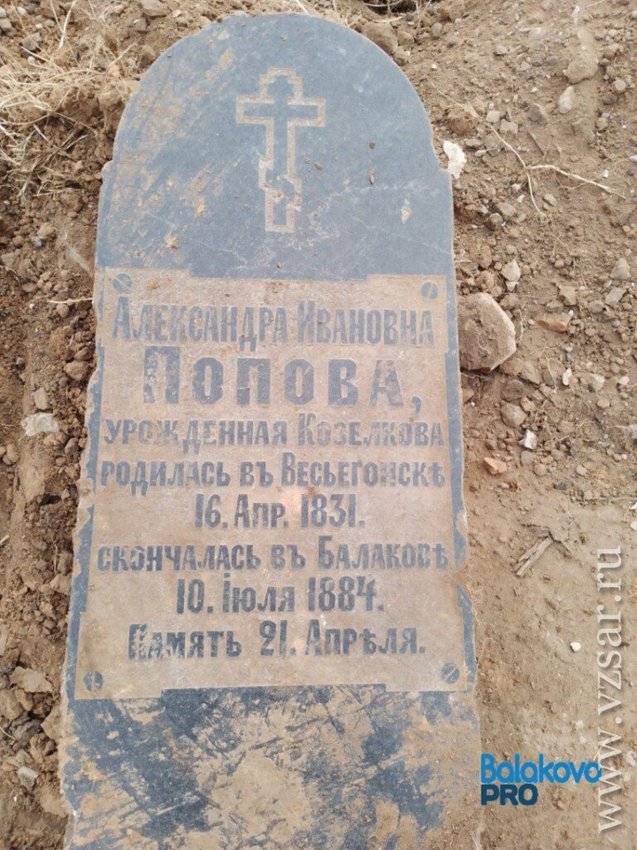 Об этом журналистам рассказал краевед, автор Балаковской народной энциклопедии Юрий Каргин. Он прислал фото, на котором видна надгробная плита с надписью, что в склепе захоронена Александра Ивановна Попова.