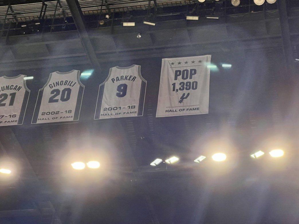 Американский баскетбольный клуб «Сан-Антонио Спёрс» поднял на стропилах стадиона «Эй-Ти-энд-Ти-центр» баннер в виде джерси в честь легендарного тренера команды Грега Поповича, обозначив вместо его игрового номера количество выигранных коллективом под его руководством матчей, перед матчем с «Бруклин Нетс», который идёт в данный момент. Пока счёт составляет 28:21 в пользу хозяев.