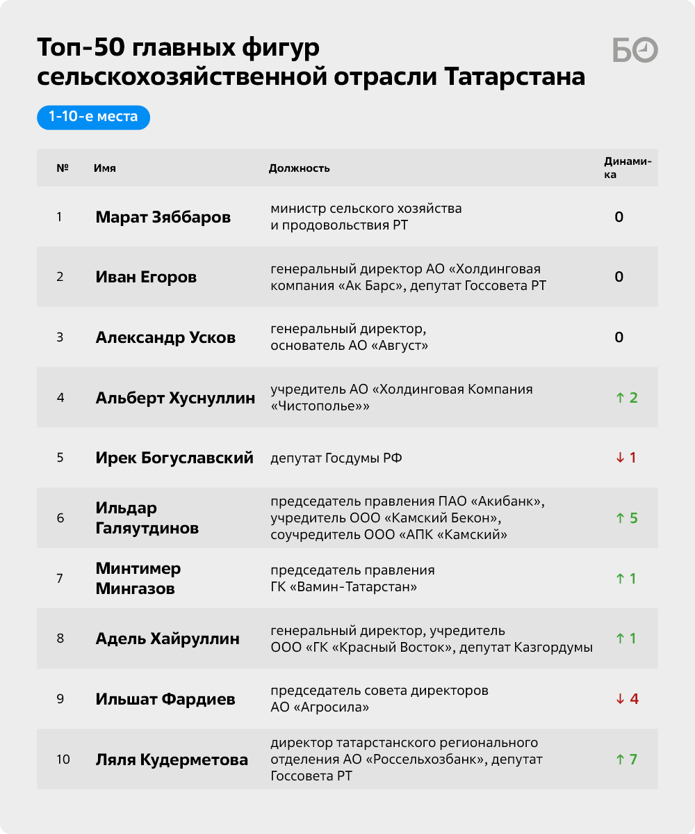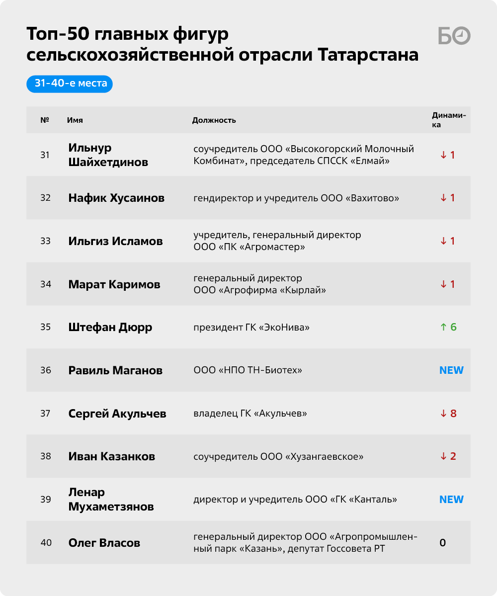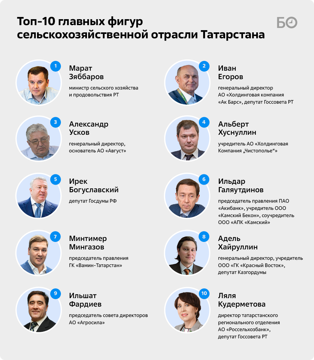 «БИЗНЕС Online» подготовил очередной топ-50 главных фигур сельскохозяйственной отрасли РТ. По традиции мы включили в него не только собственников предприятий, но и наиболее влиятельных, на наш взгляд, управленцев и банкиров, а также ряд чиновников, играющих существенную роль в развитии АПК республики. Перед составлением рейтинга мы традиционно провели серию закрытых интервью с суперэкспертами, среди которых известные предприниматели, представители госорганов и депутаты.