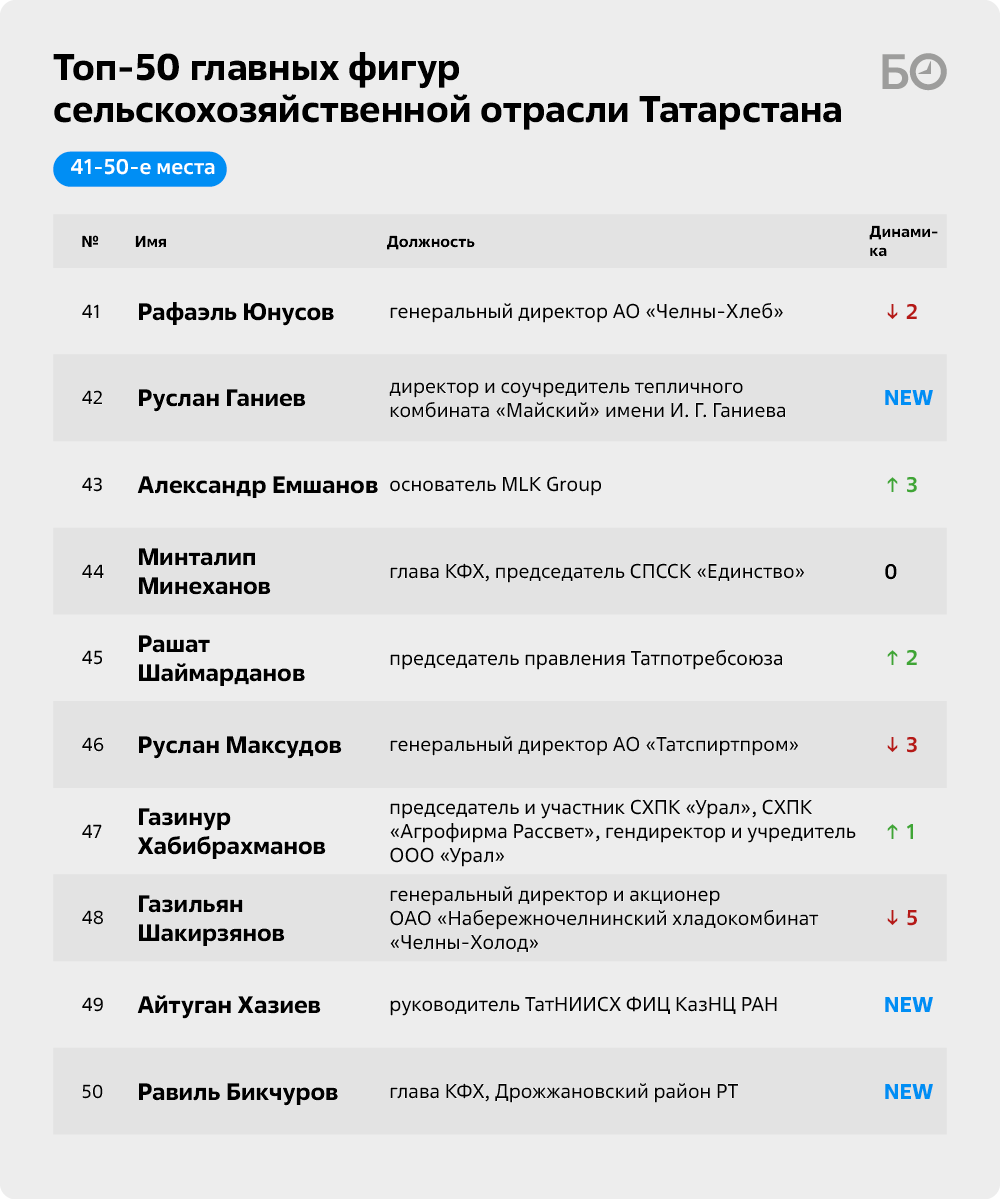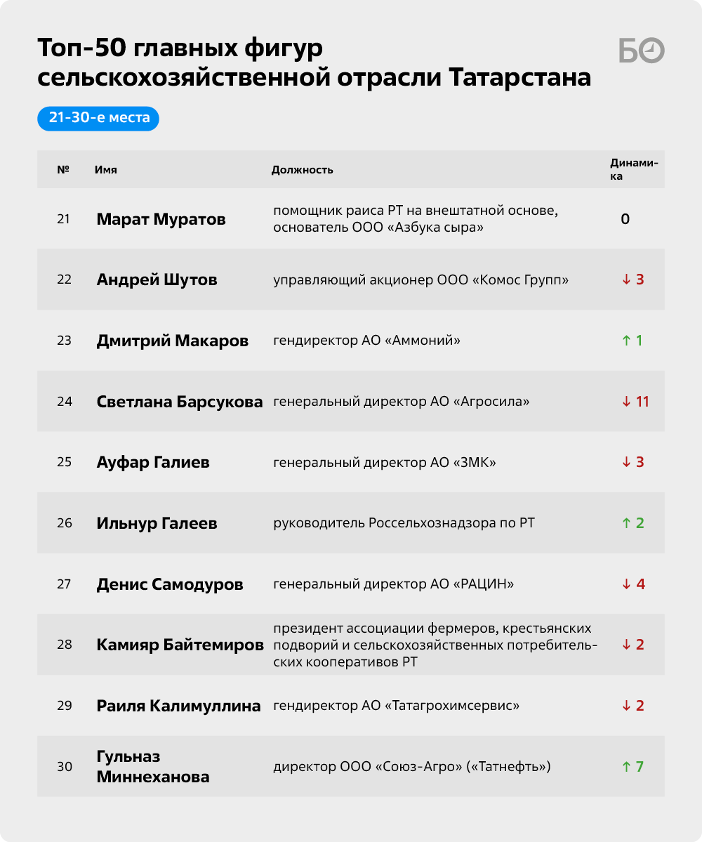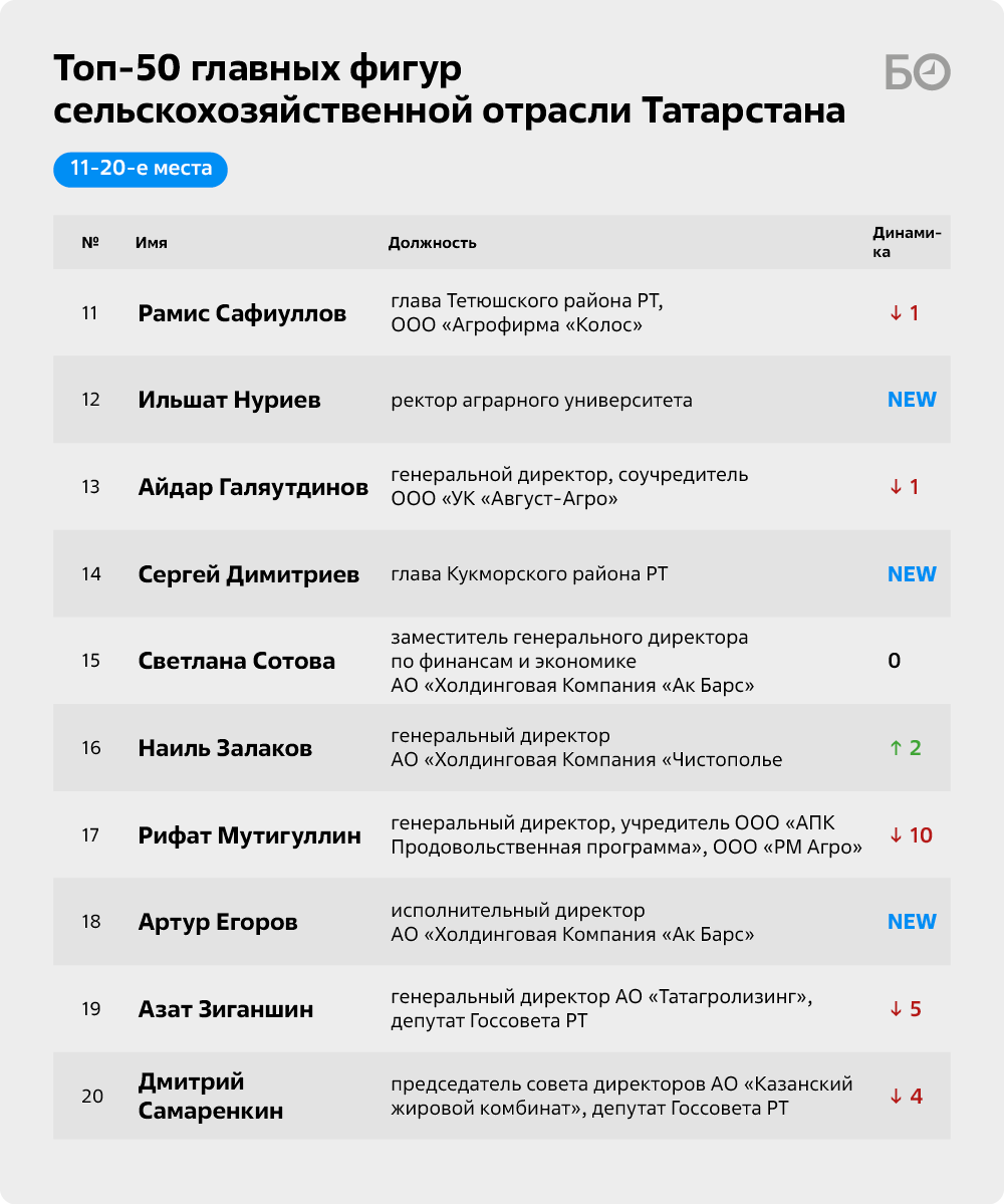 «БИЗНЕС Online» подготовил очередной топ-50 главных фигур сельскохозяйственной отрасли РТ. По традиции мы включили в него не только собственников предприятий, но и наиболее влиятельных, на наш взгляд, управленцев и банкиров, а также ряд чиновников, играющих существенную роль в развитии АПК республики. Перед составлением рейтинга мы традиционно провели серию закрытых интервью с суперэкспертами, среди которых известные предприниматели, представители госорганов и депутаты.