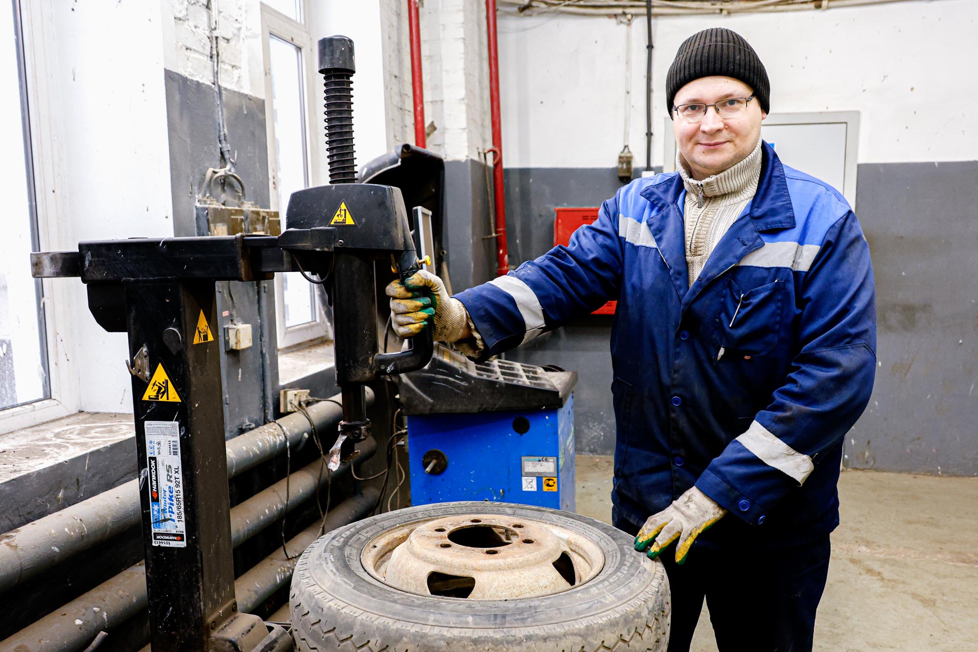 Чинит авто слесарь-ремонтник Юрий Поздняков. Слесарь по ремонту топливной аппаратуры и шиномонтажу Александр Семенов «переобувает» машины, водитель КДМ Евгений Куприянов проверяет готовность автомобиля.