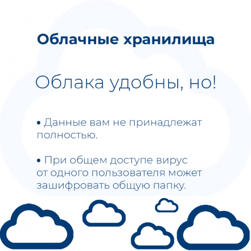 Кроме того, если папка в облаке открыта для изменения несколькими пользователями и один из них заразит её вирусом-шифровальщиком, данные будут утеряны. Заразить папку может только тот, кто имеет права на запись в неё, но дальше этой папки вирус не распространится. Гипотетически вирус может попасть на сервер, на котором хранится облако, но это крайне маловероятно для современной защиты облачных серверов.
