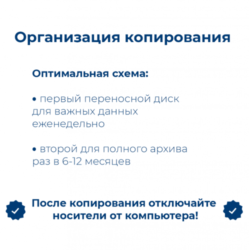 Оптимально использовать два переносных жёстких диска: один – для ежедневного или еженедельного копирования критически важных данных, второй – для полного архива раз в полгода или год. В качестве носителей подойдут USB-диски или флешки подходящего объёма, регулярно проверяемые антивирусом.
