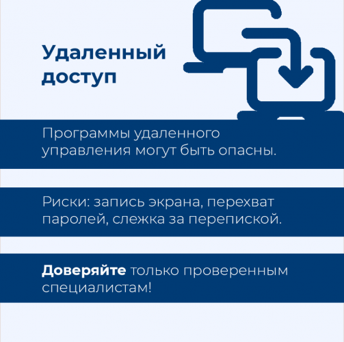 Отдельную угрозу представляют программы для удалённого управления. Если речь идёт об услуге удалённой настройки компьютеров, которую часто предлагают частные мастера, то доверять стоит только проверенным специалистам.