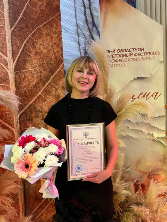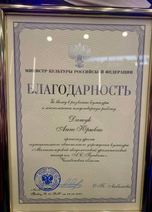 Анна Дашук – Галина в «Утиной охоте», Гертруда в «Гамлете» (16+), Надежда Петровна Бламанже в «Старой помпадурше» (16+), исполнительница плеяды других ярких ролей, любимица публики – получила благодарность министра культуры Российской Федерации «За вклад в развитие культуры и многолетнюю плодотворную работу». Эта награда – признание преданности профессии, многолетнего труда и неоценимого вклада в развитие театрального искусства.