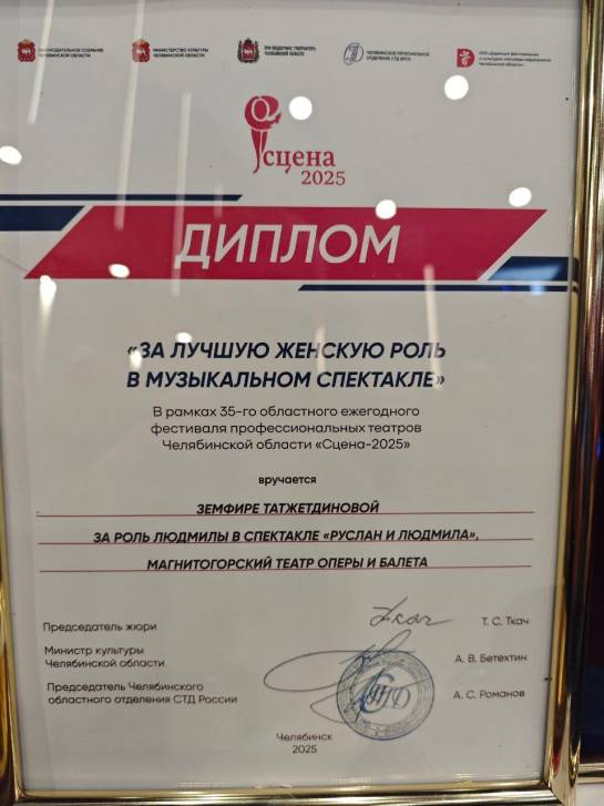 Солистка Магнитогорского театра оперы и балета Земфира Татжединова получила диплом «За лучшую женскую роль в музыкальном спектакле» за исполнение партии Людмилы в опере «Руслан и Людмила», премьера которой состоялась в июне, а художник спектакля Екатерина Соколюк отмечена в номинации «Лучшая работа художника по костюмам».