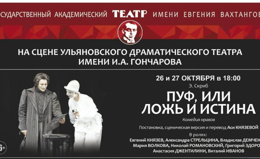С 26 по 31 октября в Ульяновске проходят «Большие гастроли»Театра имени Евгения Вахтангова. Коллектив представит три спектакля — «Пуф, или Ложь и истина» Эжена Скриба, «Люся. Признание в любви» по книгам Людмилы Гурченко и «Павел I» по произведениям Дмитрия Мережковского и Евгения Симонова, показы которых станут одним из самых ярких событий юбилейного 240-го театрального сезона в Ульяновском драмтеатре.