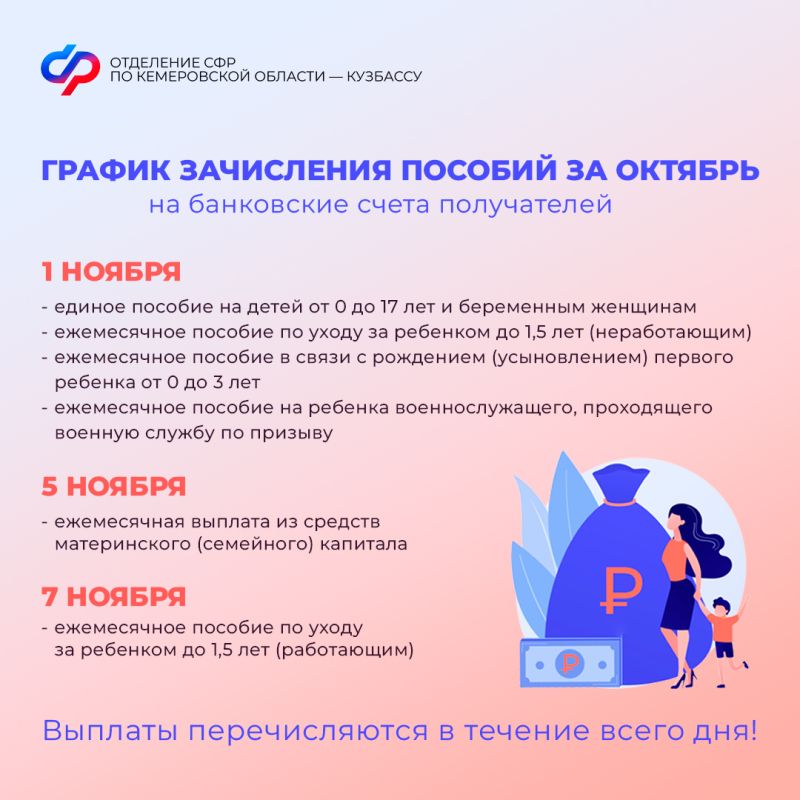 Ежемесячное пособие по уходу за ребенком до 1,5 лет для работающих граждан будет зачислено 7 ноября, а выплаты из материнского (семейного) капитала – 5 ноября.